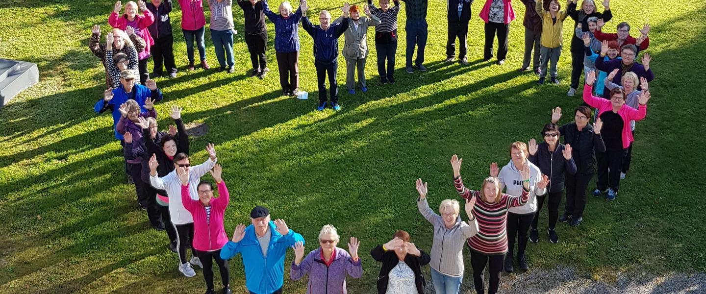 Ihmisiä nurmikolla sydämen muotoisessa kuviossa, kädet ylhäällä.