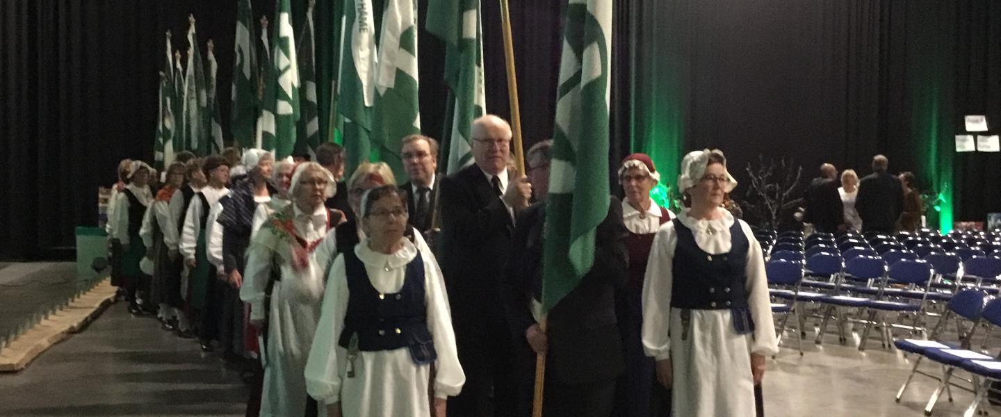 Eläkeliiton liittokokous Jyväskylässä alkoi perinteitä kunnioittaen, lippujen sisään tulolla. Lipunkantajat ja airueet marssivat saliin kokouksen alkamisen merkiksi. Tämä upea perinne jatkui yhteislaululla - Lippulaulu kajahti komeasti ilmoille tuhatpäisen kokousyleisön voimin.
