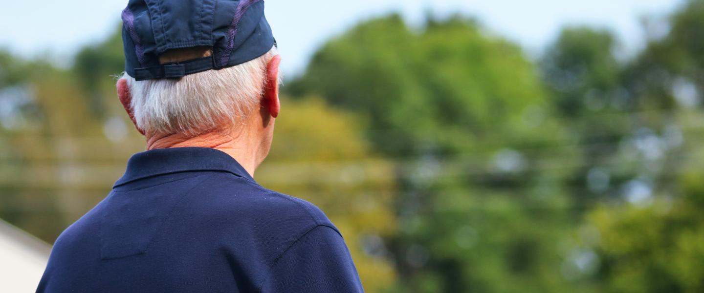 Harmaahiuksinen mies lippalakissa takaapäin kuvattuna