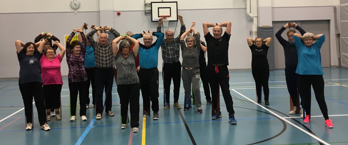 Kuva jumpasta 2.3.2020. Iloiset jumppaajat ohjaaja Rauno Kotkajuuren ympärillä. Kuva Terttu Toivonen
