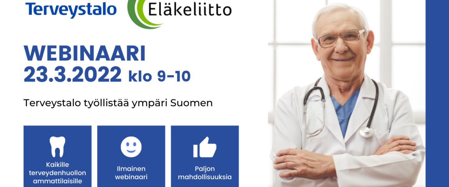 Terveystalo järjestää Eläkkeeltä töihin -hankkeen kanssa kaikille avoimen webinaarin 23.3.2022 klo 9:00-10:00, jossa se kertoo työvoiman tarpeestaan Suomessa. Webinaari on maksuton.