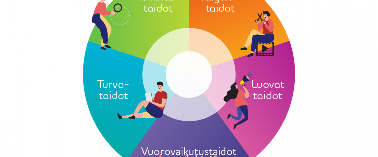 Mediataidot -juliste havainnollistaa aikuisten tarvitsemien mediataitojen eri osa-alueet ja esittää omaa mediatoimijuutta pohtimaan herätteleviä kysymyksiä.