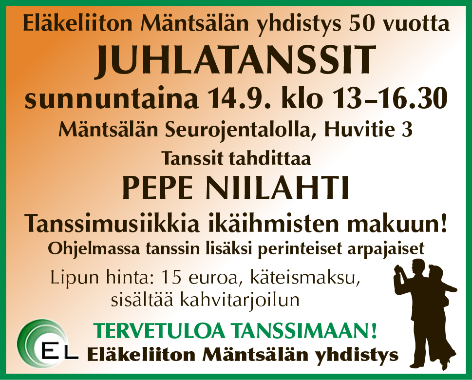 Eläkeliiton Mäntsälän yhdistys on edistänyt voimakkaasti ikäihmisten liikkumista tanssiliikunnan keinoin ja järjestää tänäkin vuonna seitsemät iloisen iltapäivän päivätanssit sunnuntaisin Mäntsälän Seurojentalolla.