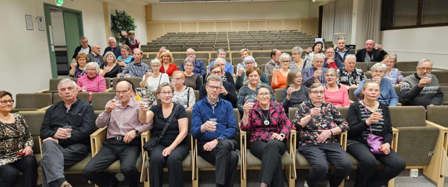 Savon muan murretta huastava Ari otti vieraat vastaan firman puolesta. Meidän tehtävänä oli tästä lähtien vaan naattia. Kun oli syöty herkullinen päivällinen, keräännyttiin auditorioon juhlatamineissa. Tarjolla pinkkiä juomaa ja suklaata. Tanssituokio pidettiin, tanssittiin mm. Zorbasta hyvin tiiviissä piirissä, välillä kantapäät seinään ja tuolien jalkoihin kolisten. Tanssit jatkui salissa. Nykyään älykellot kertovat meistä monia asioita, mm. astumamme askeleet ja kuljetun matkan. Minun kelloni kertoi, että illan aikana tanssin lähes kuusi kilometriä. - No niin.