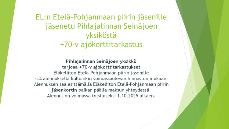 EL Etelä-Pohjanmaan piirin jäsenille JÄSENETU 70+ ajokorttitarkastukseen Pihlajalinnasta,Seinäjoen yksiköstä